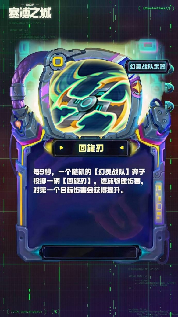 每5秒我方【幻灵战队】随机一个棋子向敌方扔出回旋刃造成物理伤害,对第一个命中的敌人造成伤害提升。