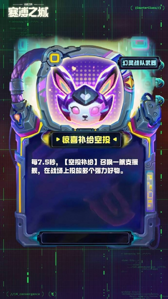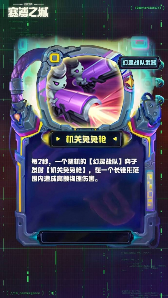 每2秒我方【幻灵战队】随机一个棋子向敌方发射【机关免免枪】,造成高额长锥形aoe物理伤害。