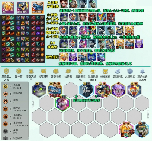 1、这套阵容采用了6堡垒2迅捷射手,9级补盖伦,如果盖伦在7级和8级就来了,优先上盖伦。