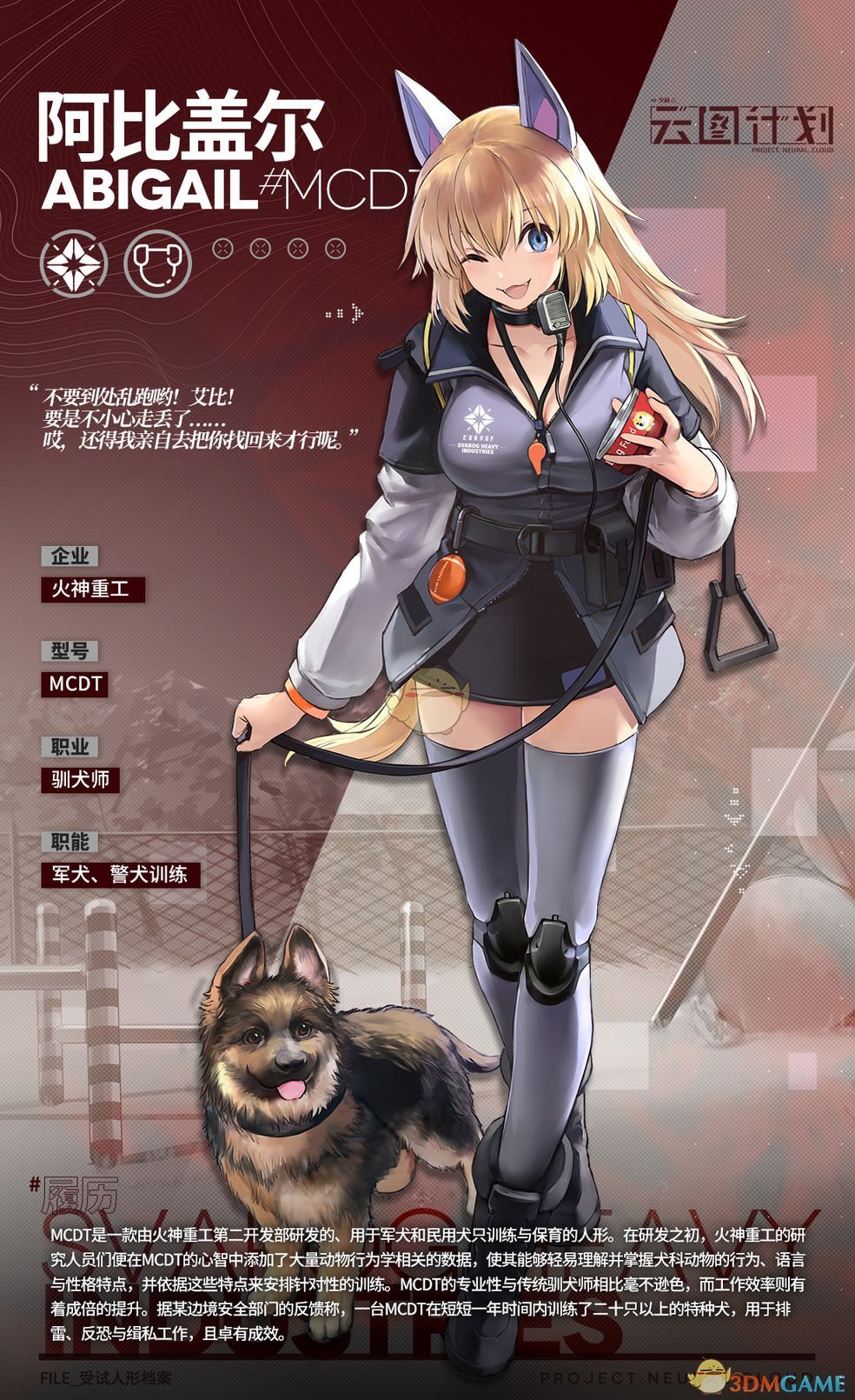 MCDT是一款由火神重工第二开发部研发的、 用于军犬和民用犬只训练与保育的人形。在研发之初,火神重工的研究人员们便在MCDT的心智中添加了大量动物行为学相关的数据,使其能够轻易理解并掌握犬科动物的行为、语言与性格特点,并依据这些特点来安排针对性的训练。MCDT的专 业性与传统驯犬师相比毫不逊色,而工作效率则有着成倍的提升。据某边境安全部的反馈称,一台MCDT在短短一年时间内训练了 二十只以上的特种犬,用于排雷、反恐与缉私工作,且卓有成效。