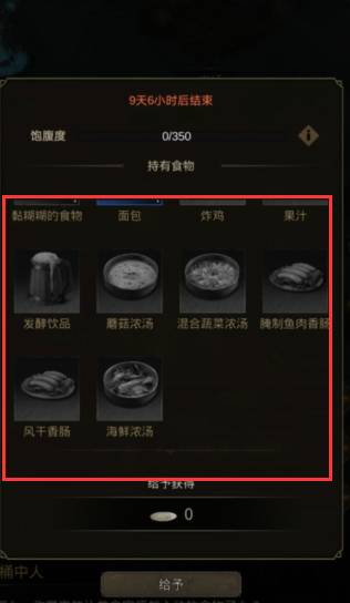 2、桶中人每天的饱食度为350,共有10款食物可供桶中人吃,如下图