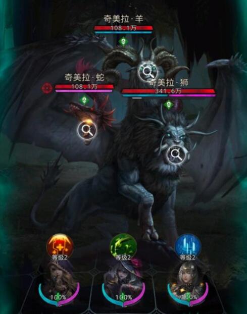 由于奇美拉有三个头,其技能上自然也有不同的攻击方向,主头(狮首)为坦克雷电单体伤害,两个次头(蛇首、羊首)则是全体AOE攻击,如果次头死亡的话,则可以提升主头的速度。