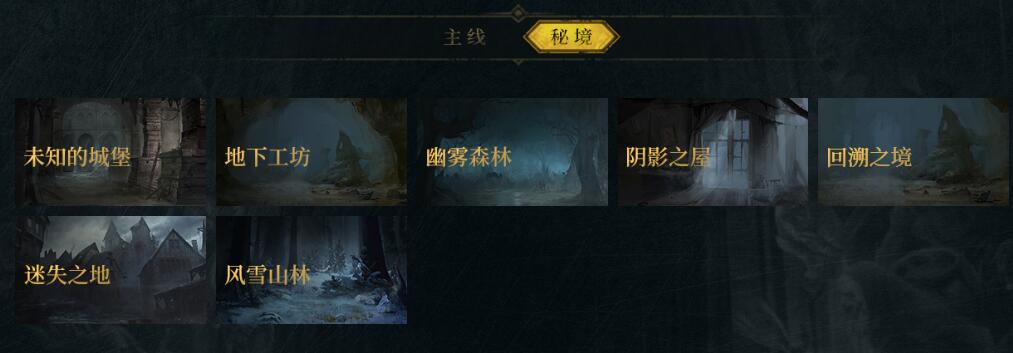 秘境1:未知的城堡 秘境2:地下工坊 秘境3:幽雾森林 秘境4:阴影之屋 秘境5:回溯之境 秘境6:真理之城 秘境7:迷失之地 秘境8:风雪山林 秘境9:狂乱之镇 秘境10:灼热之墟