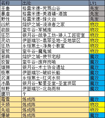 5、根据目前观察,野外刷出的魔物之魂,各等级可能出现的词条如下: