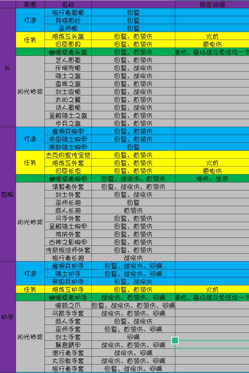 衣服类:打造的装备里,南部骑士胸甲是没有首领伤的,仅有回复,所以比如一下打了好几个衣服,如果出了南部的 ,优先给T然后奶妈,让输出穿雇佣兵和帝国骑士(当然要洗一下词缀了,首领伤洗满,回复有没有随缘)T和奶的回复建议洗满~