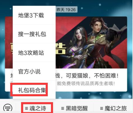 领取位置:关注【地下城堡】公众号,点击页面最下方【魂之诗】,点击【礼包码合集】,即可查看目前可以获取的密令礼包码,然后去点击【复制】就可以进入游戏去兑换相应礼包了!