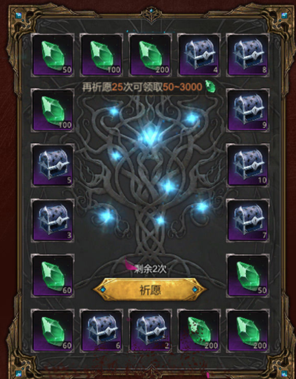 玩家每日登录可获得许愿次数。使用许愿次数有概率获得超级资源大奖。