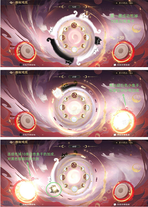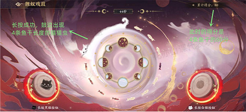 2、敲鼓按照逆时针进行。出现连续同色的小鱼干就需要长按对应颜色的鼓,长按成功会在鼓边显示猫猫虫进度计对应鱼干条数的分数