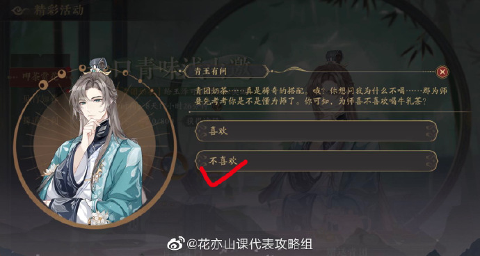 《花亦山心之月》游戏中青玉有问第一题玉泽喜不喜欢牛乳茶,答案是不喜欢,那么今天小编就给大家介绍一下花亦山心之月青玉有问第一题答案分享,有需要的小伙伴不要错过了。