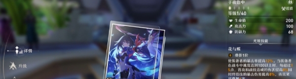 它的技能名为花与蝶,是一个巡猎技能,但它在叠影一阶的时候,能让佩戴者的暴击直接从原来的水平提高12%,并且若是该佩戴者在战斗中,他的移动速度达到了100,甚至是超过的话,只要超过15个点就能让角色的普攻以及技能所带来的伤害会再额外增加8%,除此之外终结技能的暴击伤害还会在提高8%,这个效果在游戏中还能最多叠加五次哦