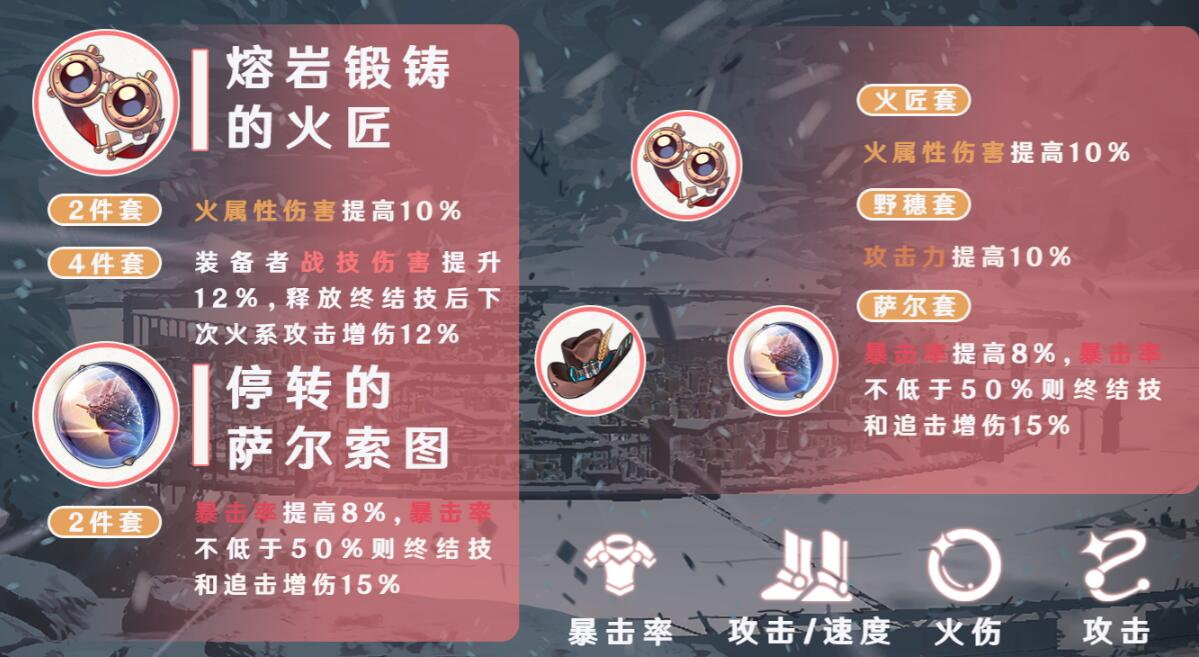 姬子的遗器套装还可以选择【熔岩锻铸的火匠】、【野穗伴行的快枪手】和【停转的萨尔索图】的二加二加二组合,可以作为姬子的过渡遗器组合。