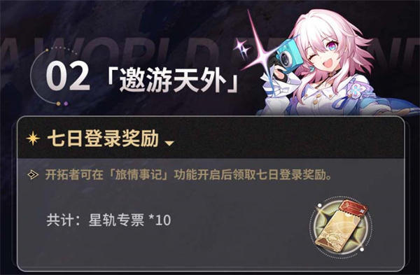 2:第二个福利就是遨游天外,我们可以在旅情事记功能开启之后领取七天的登录奖励,一共有星轨专票十张;