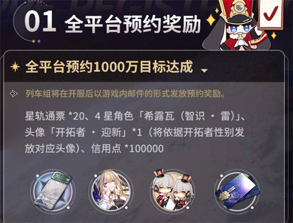 1:首先就是全平台预约奖励了,当预约达到1000万的时候可以领取星轨通票二十章,四星角色希露瓦,头像开拓者迎新,这个会根据你的性别发放的,信用IG点十万;