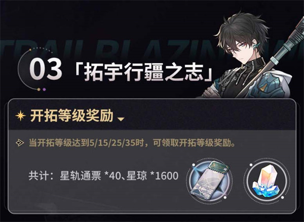 3:第三个是拓宇行疆之志,当我们的等级达到三十五级的时候可以获得星轨通票四十张,星琼1600个;