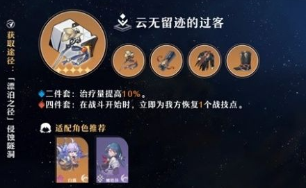 治疗效果类遗器,提供治疗加成和少量的战技点恢复,目前仅2位治疗角色,没什么好说的,前期不推荐刻意去刷,带几个词条较好的散件过渡足够;