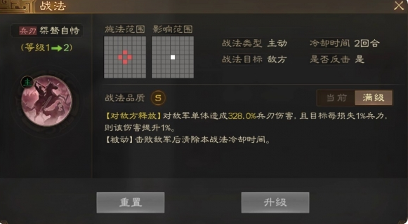 对敌军单体造成156%~312%兵刃伤害,且目标每损失1%兵力,则该伤害提升1%。