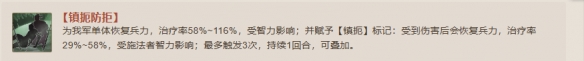 为我军单体恢复兵力,治疗率58%~116%,受智力影响;并赋予【镇扼】标记:受到伤害后会恢复兵力,治疗率29%~58%,受施法者智力影响;最多触发3次,持续1回合,可叠加。