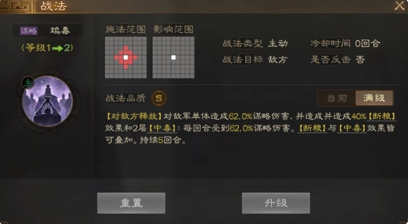 对敌军单体造成30%~60%谋略伤害,并造成50%【断粮】效果和2层【中毒】:每回合受到30%~60%谋略伤害。【断粮】与【中毒】效果皆可叠加。持续5回合。