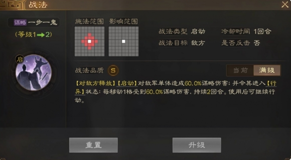 【启动】对敌军单体造成30%~60%谋略伤害;并令其进入【行异】状态:每移动1格受到30%~60%谋略伤害,持续2回合。