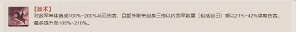 对敌军单体造成100%~200%兵刃伤害,且额外附带自身三格以内我军数量(包括自己)乘以21%~42%谋略伤害,最多提升至105%~210%。