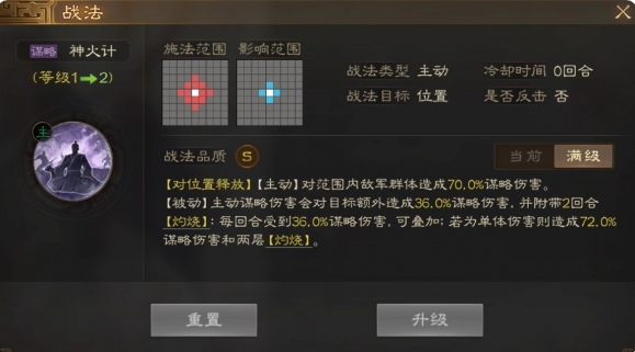 【被动】主动谋略伤害会对目标额外造成17%~34%谋略伤害(额外伤害不触发任何战法效果),并附带2回合【灼烧】:每回合受到17%~34%谋略伤害,可叠加;若为单体伤害则造成34%~68%额外伤害和两层【灼烧】。
