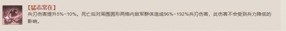 兵刃伤害提升5%~10%。死亡后对周围圆形两格内敌军群体造成96%~192%兵刃伤害,此伤害不会受到兵力降低的影响。