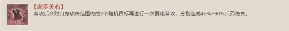 普攻后会对自身攻击范围内的2个随机目标再进行一次弱化普攻,分别造成45%~90%兵刃伤害。