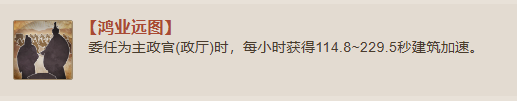 委任为主政官(政厅)时,每小时获得114.8~229.5秒建筑加速。