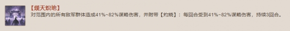 对范围内的所有敌军群体造成41%~82%谋略伤害,并附带【灼烧】:每回合受到41%~82%谋略伤害,持续3回合。