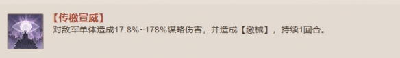 对敌军单体造成17.8%~178%谋略伤害,并造成【缴械】,持续1回合。