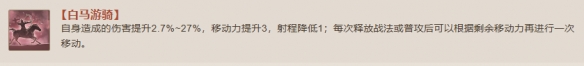自身造成的伤害提升2.7%~27%,移动力提升3,射程降低1;每次释放战法或普攻后可以根据剩余移动力再进行一次移动。
