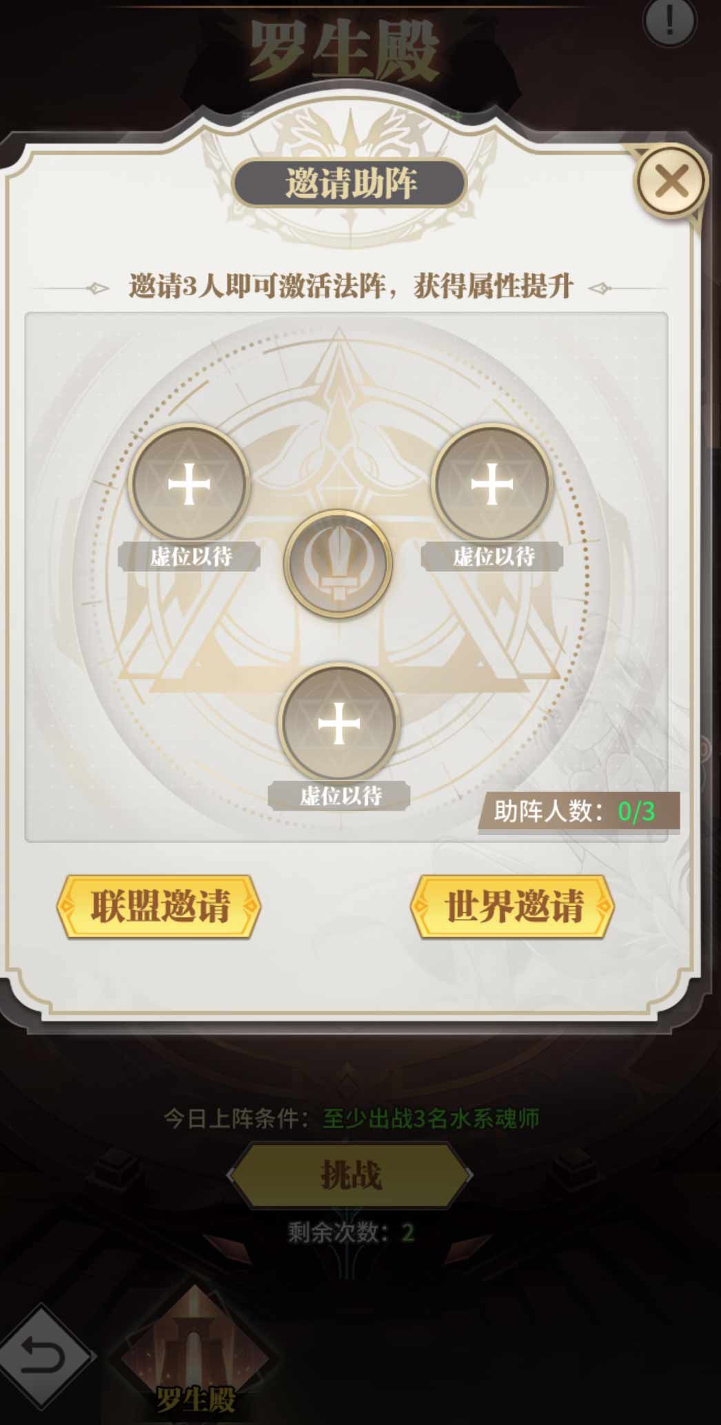 3、挑战前可以邀请3名维序者助阵,点击【个人信息】-【罗生殿助阵】可以帮好友助阵,助阵满3人可以集火伤害提升20%及技能【再生】法阵,助力挑战