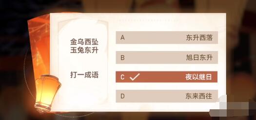 答案:金乌代表太阳,西坠表示太阳下山;玉兔代表月亮,东升表示月亮升起。这与“夜以继日”的意思相符合,表示夜晚接着白天继续进行。因此是夜以继日。