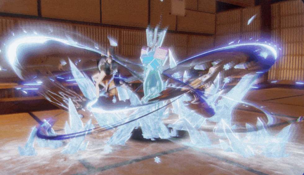 深舞咒刀横扫并上挑,造成冰属性伤害衍生技能「镜花·漂冰」