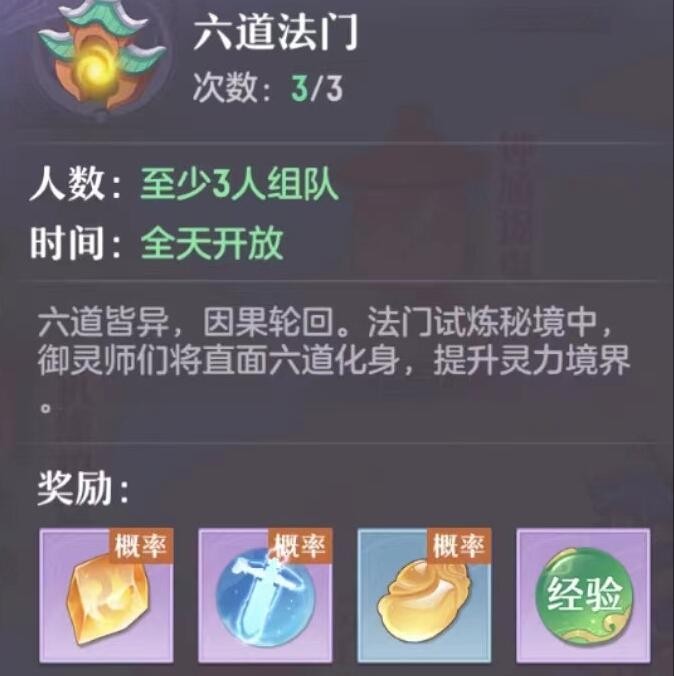六道法门,这是我们每日获得装备灵石或者打造强化装备(特效)的获取方式,能不能赚大钱就靠爆不爆当前等级需要的灵石了。这是一个在满宝石的情况下可以开开心心挂机的任务。