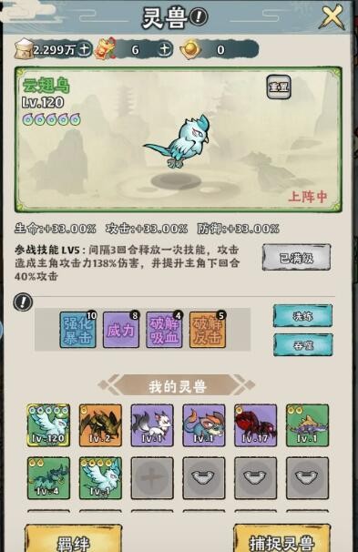 5、灵兽有条件就选择应龙,(氪佬的选择,咱这边也不多说了)推荐:还是养绿色鸟(赌狗成分),刷个增加爆伤,强攻,嘎嘎猛一路所向披靡。(我这个鸟是废了。刷鸟以及吞噬的细节就不在这里说了,论坛上搜索就会有,很详细)祝每个修仙者运气爆棚!