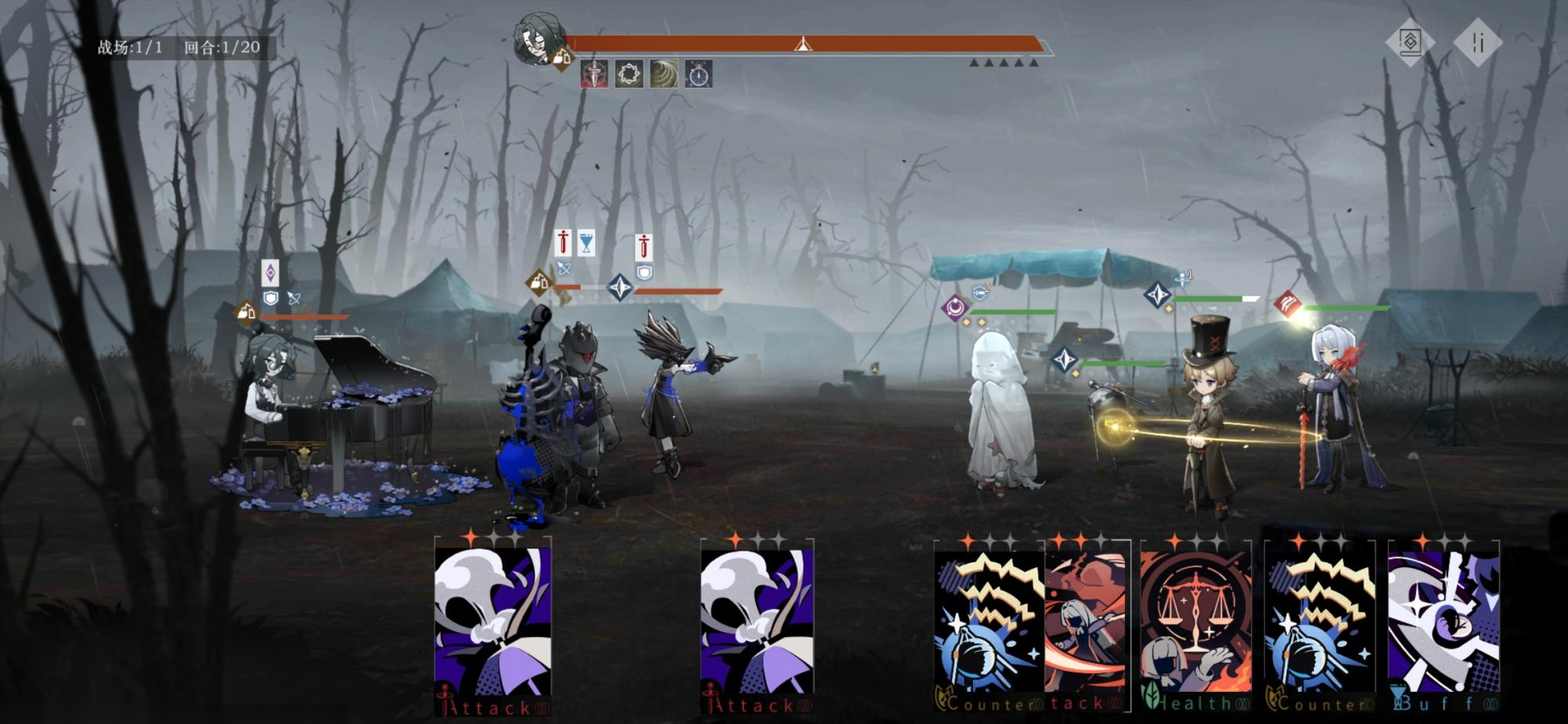 第一个思路是集火秒掉boss,因为boss低于50%血量,回复一次血后会给自己挂扣血的状态,等他血扣完了自然就赢了。(这一关BOSS死了以后直接通关)但是因为有盾迎兵士(下面我就叫盾迎了)boss的免伤非常高,很难打动,所以我是这么想的。