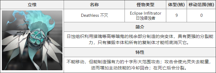 不能移动,但能制造强有力的十字形大范围攻击;攻击会使光灵失去能量,进而增加主动技能的冷却回合;在死亡后会分裂。