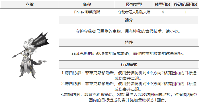 2.清扫防御:菲莱克斯移动后,使用武装防御对4个方向2格范围内的目标造成伤害并击退。