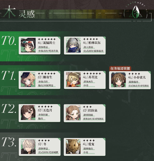 T2:这些角色在特定的战略情况下具有一定的价值。尽管相对于TO和T1角色来说,他们的实力稍逊一-筹, 但在特定场合中,他们能够发挥出独特的战术优势。如果您需要填补某些特殊需求,可以考虑投入资源培养这些角色