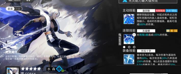 水系爆破,主动技能拥有全屏位移的机制,目前在所有的水系光灵内,拥有位移技能的光灵并不多,渡可以用来当做队伍的位移挂件,配合狙手莉丝打游击,属于功能性比较优秀的光灵;