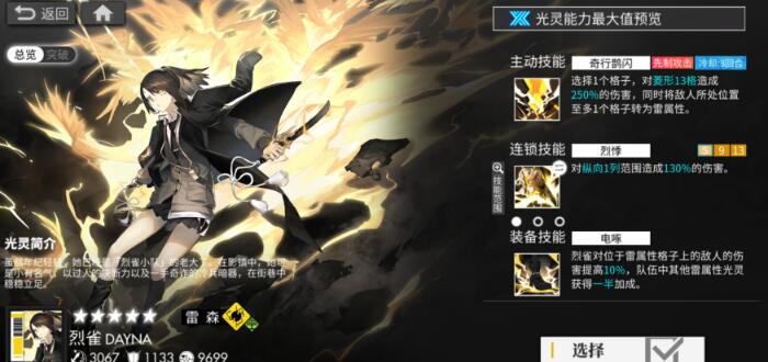 职业爆破,满级3067攻击,防御1133,生命9699,4个光灵中属于他属性最低,但烈雀的机制齐全,主动技能输出+转色,在觉醒后可以解锁电啄,提高雷属性格子敌人的伤害,并且给队伍提供一半加成,如果你队伍内拥有雷系主C或6星雷变化光灵的话,可以选择烈雀进行输出;