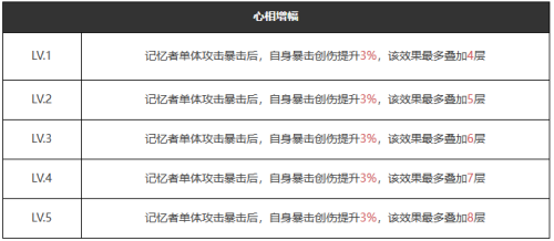 记忆者单体攻击暴击后,自身暴击创伤提升3%,该效果最多叠加4/5/6/7/8层。