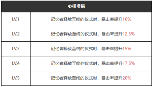 记忆者施放至终仪式时,暴击率提升10%/12.5%/15%/17.5%20%。