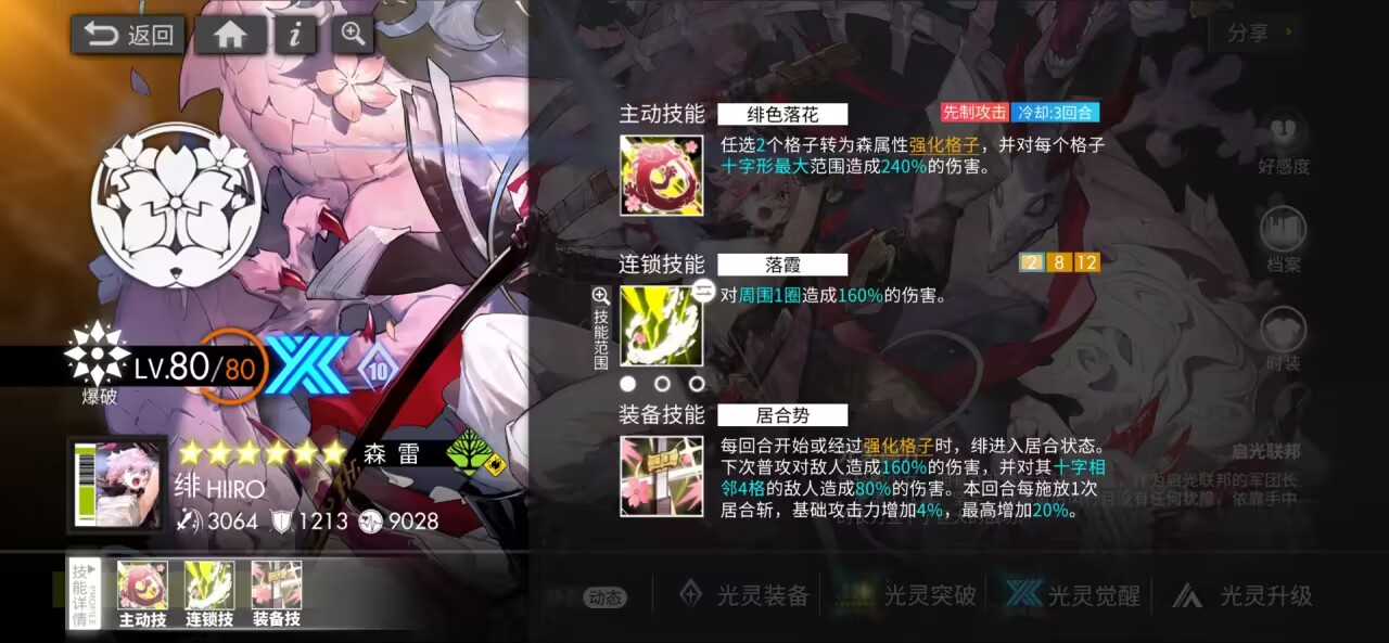 第一次觉醒可以开启装备技能,第二次觉醒则会使居合势在踩中强化格时也会触发,第三次觉醒后每次释放居合斩使自身本回合获得4%基础攻击力,最高叠加20%。