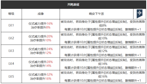 LV.1:仪式威力提升16%,治疗率提升8%,被攻击时,若自身处于[属性提升][状态增益][反制],受到伤害降低8%,每累计获得10次[属性提升][状态增益][反制],激情额外+1。