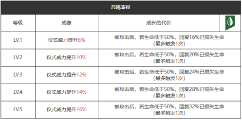 LV.5:仪式威力提升16%,被攻击后,若生命低于50%,回复32%已损失生命(最多触发1次)。