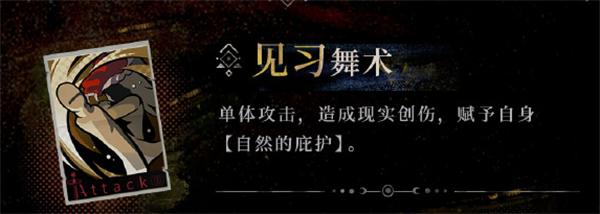 1、见习舞术:对敌方单体目标造成现实创伤,赋予自身一层自然的庇护状态。