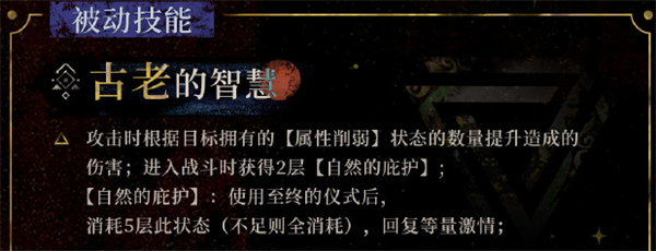 古老的智慧:在战斗状态下获得两层自然的庇护,根据目标数量增加伤害。