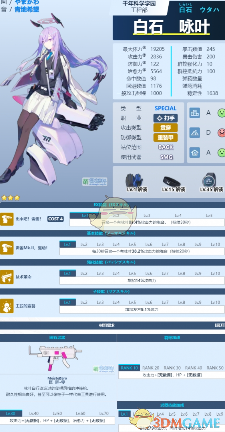 《蔚蓝档案》作为一款备受欢迎的ACG手游,以清新的画风和色调而著名。而其中有许多不同的角色。对于新手玩家来说,这些角色可能还不太了解,那么以下就为大家分享蔚蓝档案关于白石咏叶的图鉴和技能数值,感兴趣的小伙伴们一起来看看吧。